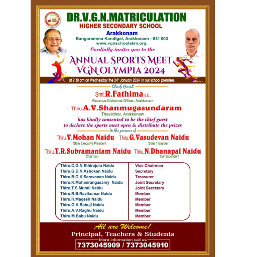 Dr. V. Genguswamy Naidu Vidhyalaya was started in the year 1985 for the welfare of all the communities and public nature of educational and charitable purposes. During the academic year 1989-90, the school was upgraded to the status of a Matriculation school, upto VII Std. The School has been renamed as Dr.V.G.N. Matric.