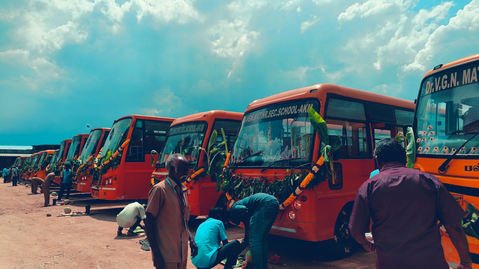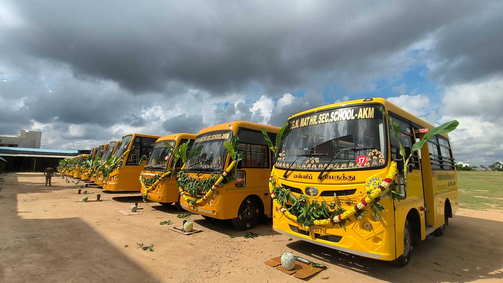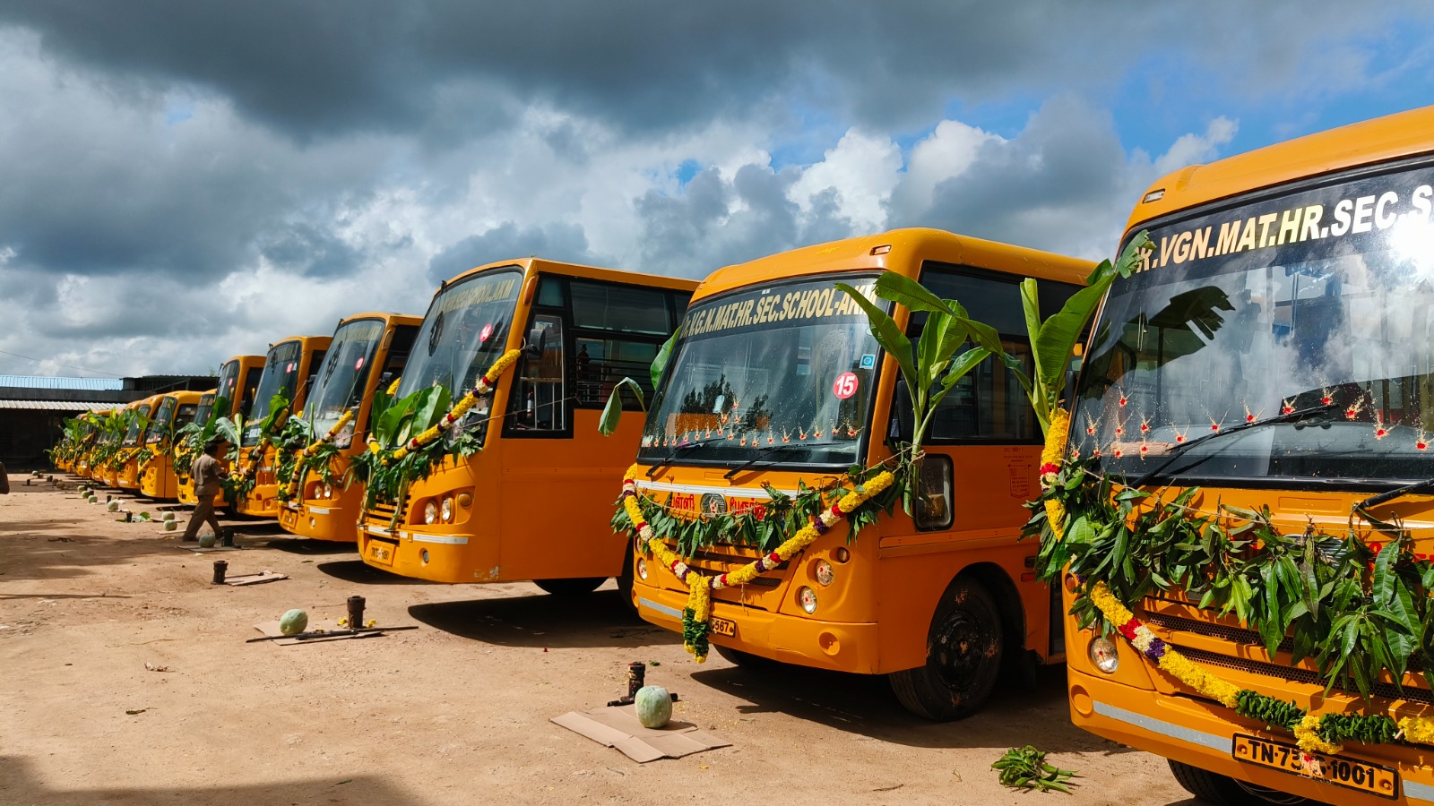 To ensure safe travel the school has its own fleet of school buses designed as per standards and manned by trained drivers and personnel sensitized to the needs of small children.